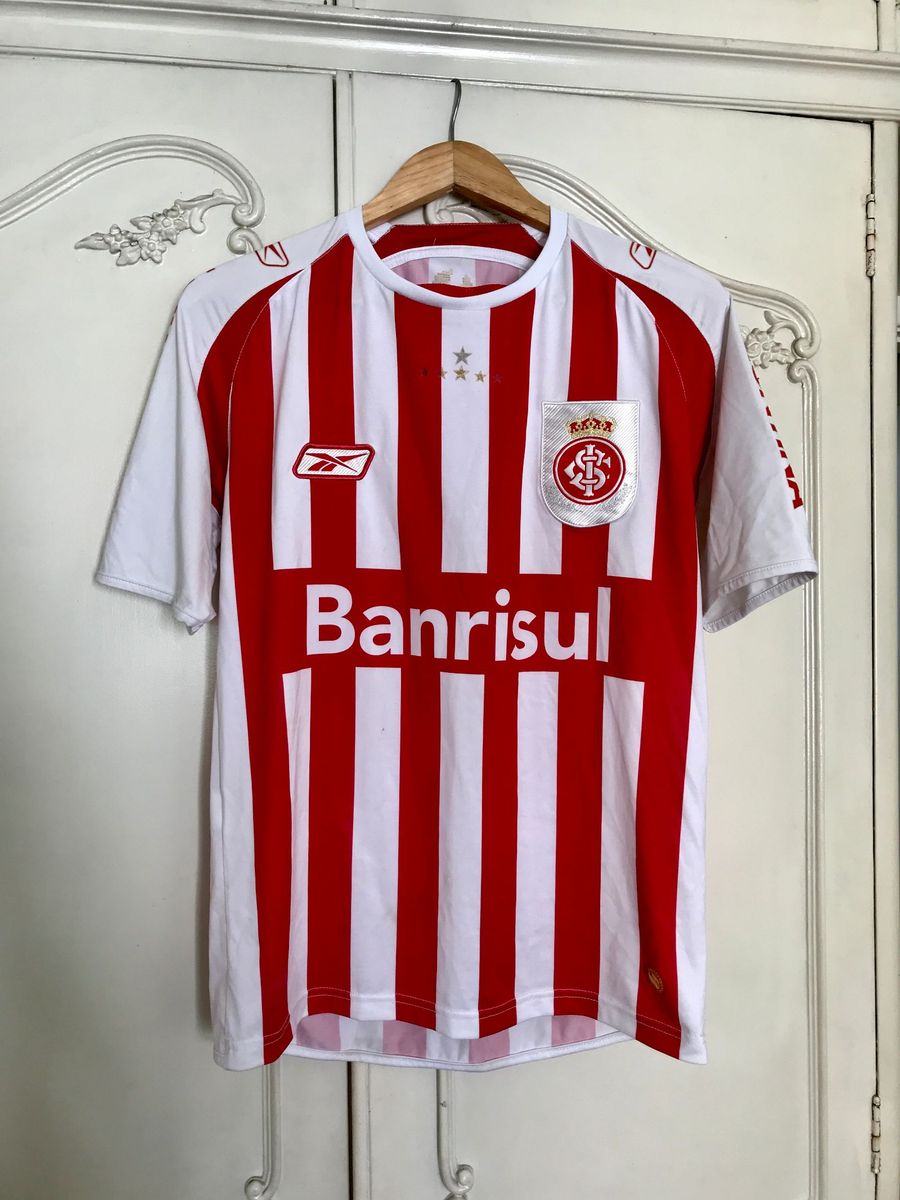 Se a Reebok tivesse feito essa camisa pro Náutico, que pelo menos realmente usa esse padrão, Recife tinha explodido em revolta. Fazer isso pro Inter então é praticamente cuspir na mãe de metade do Rio Grande do Sul. É uma camisa tão feia que é difícil achar foto do verso. Tem esses dentinhos saindo do suvaco, uma listra em forma de cabide no verso da camisa, e temos a nossa cereja do bolo nesse escudo por fora do escudo. Escudo aliás, que por alguma razão, tinha uma coroa em cima. Porque todo time que ganha alguma tríplice coroa quer fazer cosplay de Real Madrid?